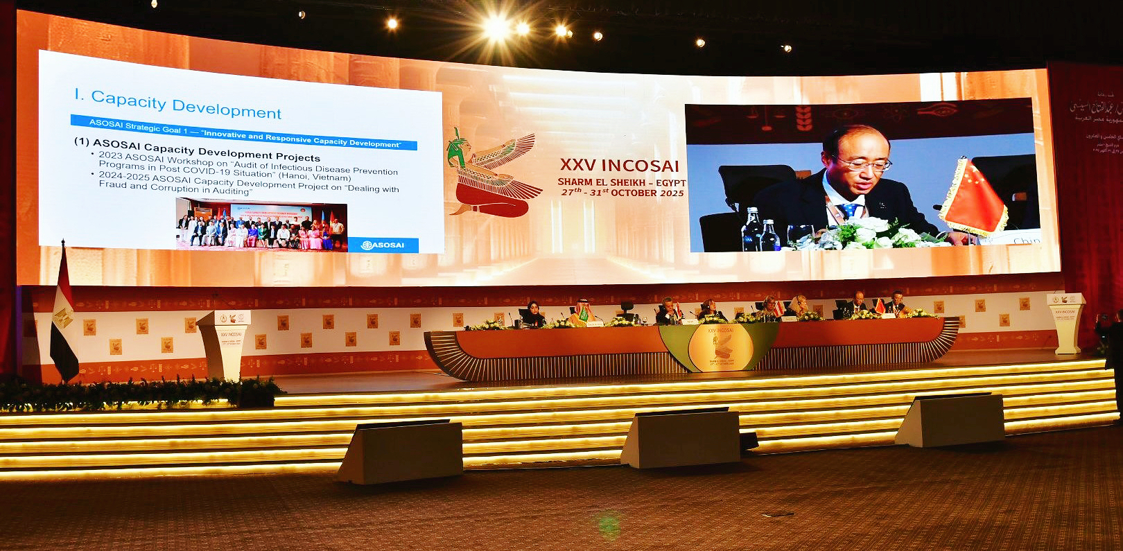 10月27日至31日,世界审计组织第25届大会在埃及沙姆沙伊赫召开,中国审计署审计长侯凯率中国审计代表团出席。经全体与会代表推举,侯凯与埃及审计院院长尤素福共同主持大会,并作为亚洲审计组织秘书长向大会作亚洲审计组织三年工作报告。
