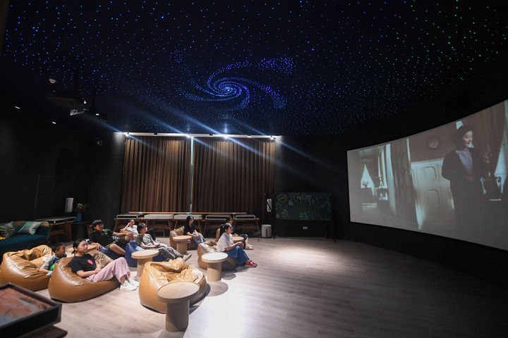 居民在位于杭州市富阳区银湖街道硅谷社区的“合之舍”书房的影视厅内观看电影。该书房是银湖街道“15分钟品质文化生活圈”的重要示范点(2022年7月2日摄)。新华社记者 徐昱 摄