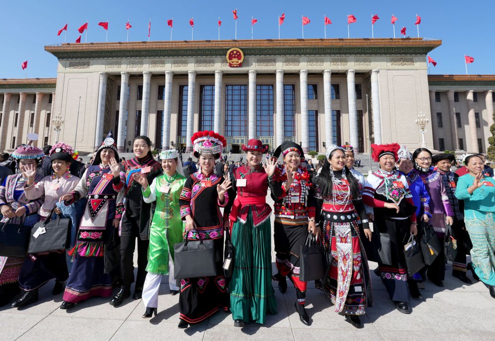 2024年3月8日,十四届全国人大二次会议第二次全体会议结束后,女代表在北京人民大会堂前合影留念。新华社记者 王毓国 摄