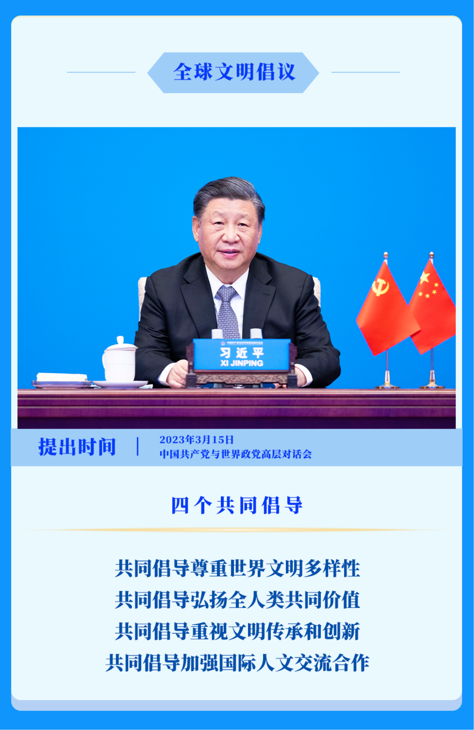 秉持构建人类命运共同体这一核心理念,中国以历史自信把握大势,以历史主动奋发有为。循道而行,中国将继续与世界各国一道,以全球发展倡议、全球安全倡议、全球文明倡议、全球治理倡议为战略引领,在砥砺奋进中破解全球性挑战,在携手奋斗中完善全球治理,共同推动建设持久和平、普遍安全、共同繁荣、开放包容、清洁美丽的世界,让人类赖以生存的唯一家园更加美好。