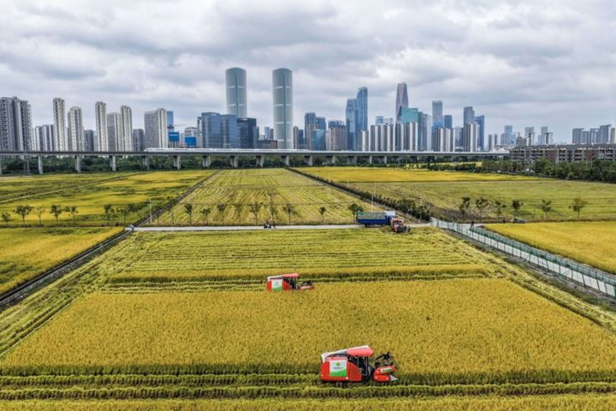 2025年10月21日,收割机在浙江省杭州市萧山区世纪田园粮食功能区的稻田里收割水稻,远处高铁列车飞驰而过(无人机照片)。新华社记者 徐昱 摄