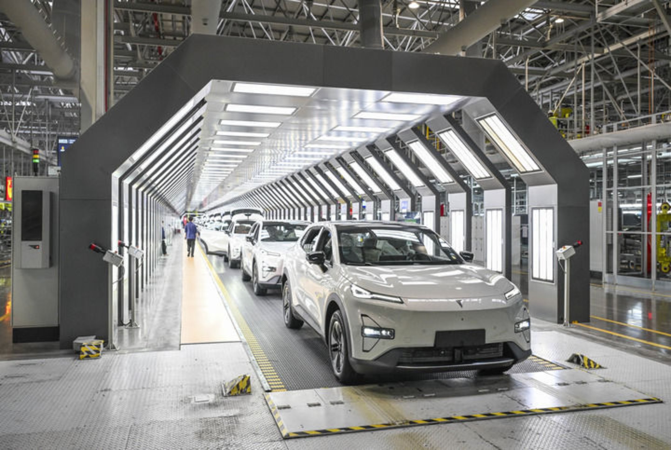 这是2025年1月9日在位于重庆市渝北区的长安汽车数智工厂总装车间拍摄的即将下线的新能源汽车。新华社记者 王全超 摄