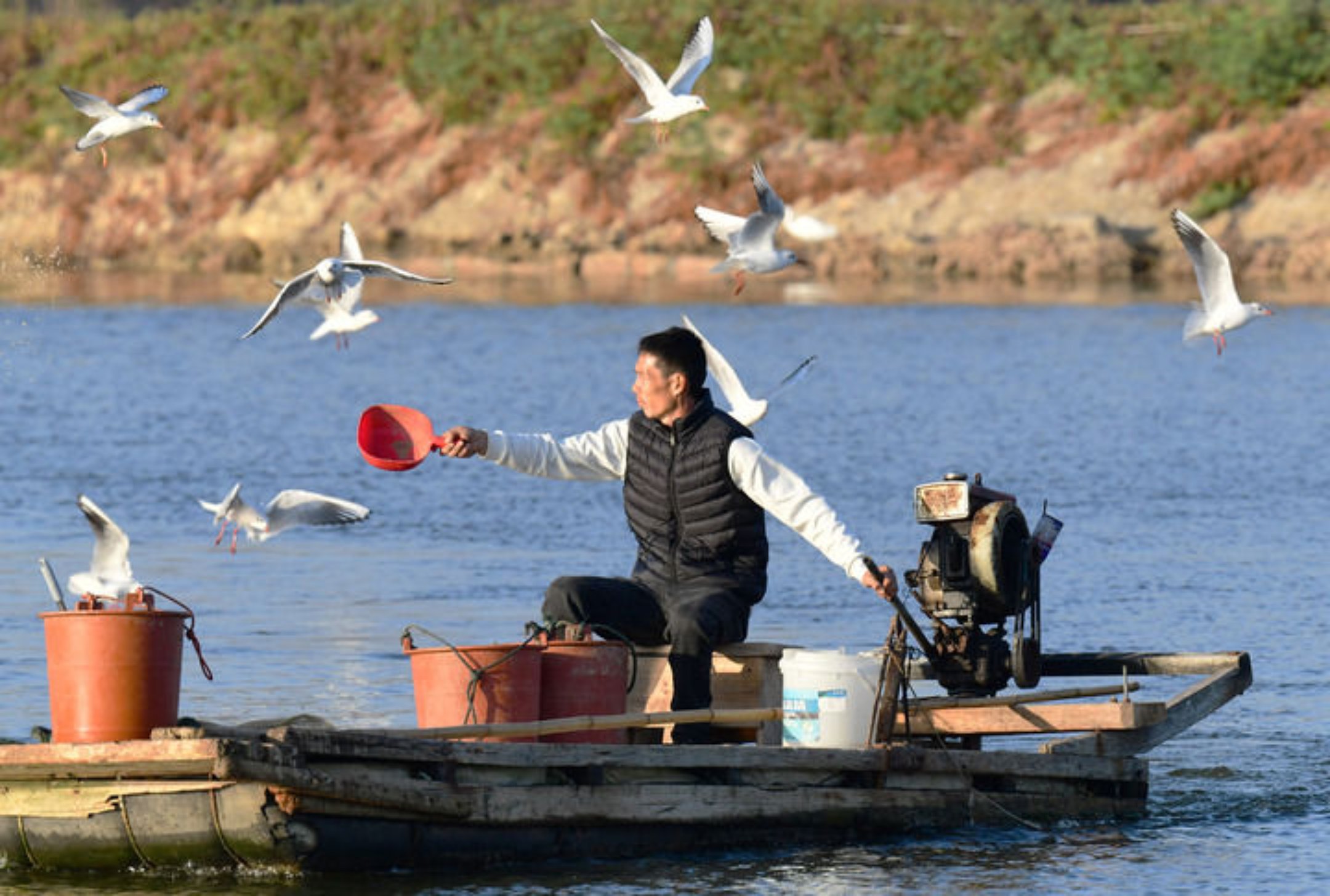 2025年12月10日,福建省漳州市佛昙镇东坂村河豚养殖户在给河豚投喂食物。新华社记者 魏培全 摄